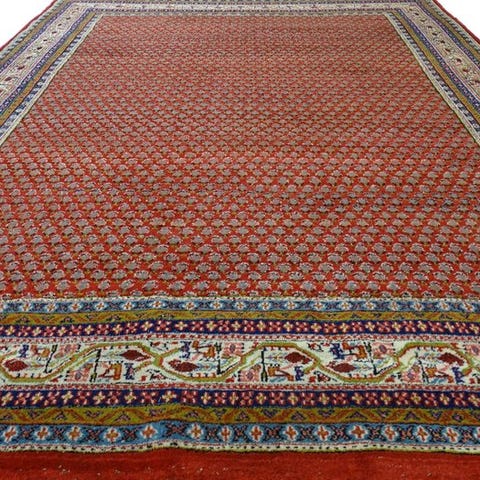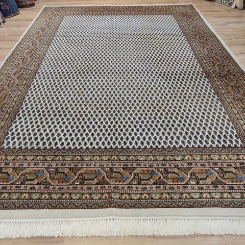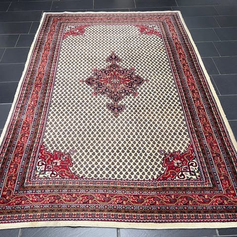 Oprindelse: Indien; Mir - Gereinigd håndknyttet orientalsk tæppe i uld på bomuld, størrelse 242 cm x 168 cm, cirka 160.000 knuder pr. m², professionelt renset og i meget god stand med certifikat. Klik på den blå "gå til varen" knap, for at købe eller byde på denne vare. Den samlede pris vil blive vist inden du afgiver dit bud.