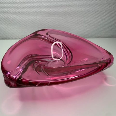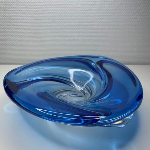 Val Saint Lambert skål af emeraldgrøn og klart blykrystal, designet af René Delvenne, model Patelle 36 cm, dimensioner 36 cm bred og dyb, 8,5 cm høj, vægt 7,2 kg, fremstillet i Belgien i 1960erne, underskrevet i bunden og med originalt label, i god stand med små tegn på ældning og pletter. Klik på den blå "gå til varen" knap, for at købe eller byde på denne vare. Den samlede pris vil blive vist inden du afgiver dit bud.