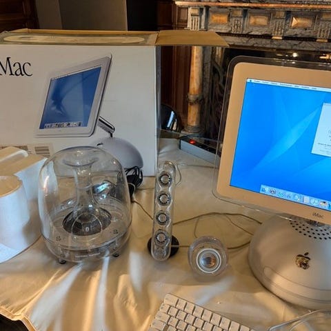 Tilbudt her er et originalt Apple iMac G3 Bondi Blue-tilbehørssæt (1998), som blev solgt sammen med de allerførste iMacs. Dette sæt repræsenterer den komplette ud-af-boksen-oplevelse af Apples legendariske Bondi iMac-æra.