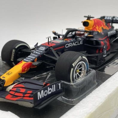 Detaljerne i dette 1:8-skalamodel er bemærkelsesværdige, såsom den præcise layout, som Max Verstappen kørte med. Også notatet i monocock er synligt.