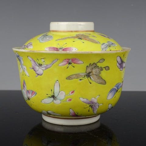 Pragtfuldt stort kinesisk porcelæn i Famille rose-stil fra 18. og 19. århundrede. Meget smukt håndmalet med feniks/blomsterdekoration. Bagsiden er Qianlong-mærket. Meget høj kvalitet og meget eftertragtet af samlere.
