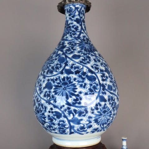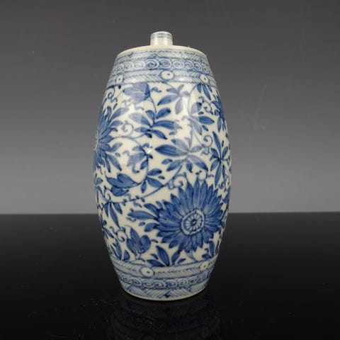 Kinesisk blå- og hvid porcelæns vase med blomsterdekoration fra Kangxi-perioden (1662–1722), 15,8 cm høj og 8 cm i diameter; i meget god stand med små aldersrelaterede tegn. Klik på den blå "gå til varen" knap, for at købe eller byde på denne vare. Den samlede pris vil blive vist inden du afgiver dit bud.