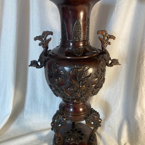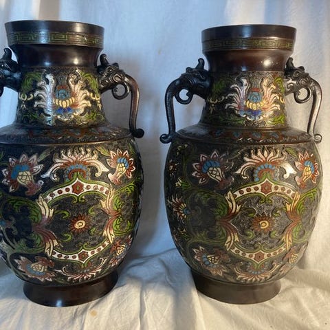 Bronze vase med polykromt cloisonné em enameling, dateret Meiji-perioden (ca. 1868–1912), dekoreret med stiliserede japanske krigere og håndtag formet som mytiske dyrhoveder, mål: 20 cm bred, 40 cm høj, 20 cm dyb, vægt 3,5 kg. Klik på den blå "gå til varen" knap, for at købe eller byde på denne vare. Den samlede pris vil blive vist inden du afgiver dit bud.