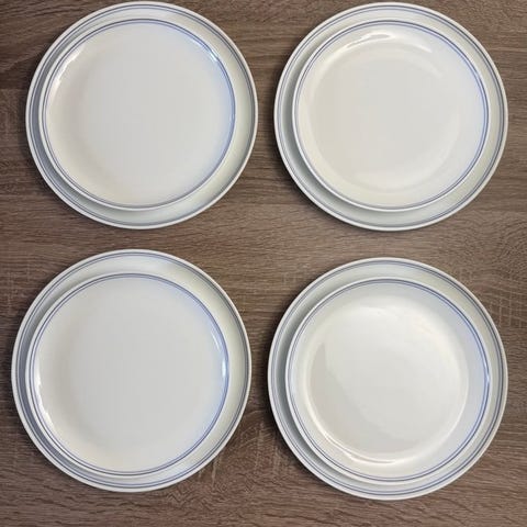 KLM atten-tyve porcelæns-tallerkener og skåle i hvidt og blåt, designet af Marcel Wanders og fremstillet i Nederlandene, i ny tilstand fra perioden 2000–2010, tallerkenerne har 19 cm i diameter, højde 4 cm og bredde 19 cm. Klik på den blå "gå til varen" knap, for at købe eller byde på denne vare. Den samlede pris vil blive vist inden du afgiver dit bud.