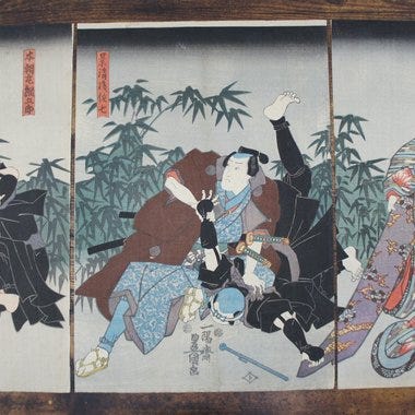 Håndsigneret originalt træktryk af Utagawa Kunisada, betitlet Ichimura Uzaemon XIII as Ushiwakamaru (1861), Edo-periode Washi Nishiki-e-tryk, 36,5 cm x 25 cm, vejer 500 g, generelt i god stand med nogle aldersrelaterede pletter og let misfarvning. Klik på den blå "gå til varen" knap, for at købe eller byde på denne vare. Den samlede pris vil blive vist inden du afgiver dit bud.