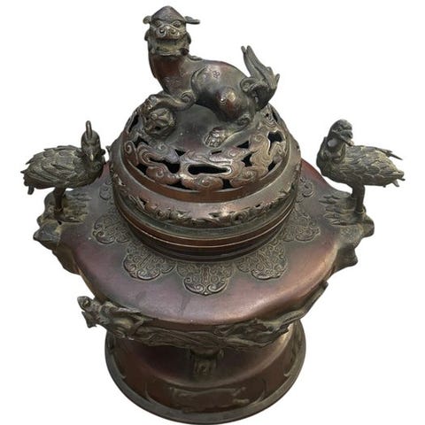 Meiji-periode patineret bronzeringbrænder fra Japan, 42 cm høj, 19 cm bred, vægt cirka 3,2 kg, i god stand og original, fra privat samling, med to håndtag og reliefbilleder på ydersiden. Klik på den blå "gå til varen" knap, for at købe eller byde på denne vare. Den samlede pris vil blive vist inden du afgiver dit bud.