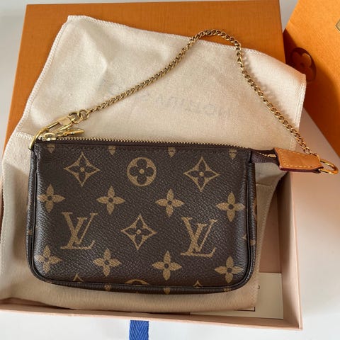 Louis Vuitton Mini Pochette i brun coated canvas, 25 cm bred og 10 cm høj, i fremragende stand med let slid, komplet med æske, dust bag og kvittering. Klik på den blå "gå til varen" knap, for at købe eller byde på denne vare. Den samlede pris vil blive vist inden du afgiver dit bud.