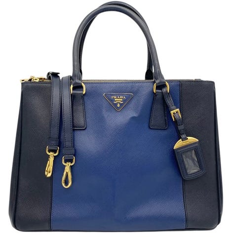 Prada læderhåndtaske i grøn og blå, one size, 23 cm høj, 31 cm bred og 15 cm dyb, magnetlukning, indvendigt tre lommer og en lynlåslomme, tre udvendige lommer, brugt med slidmærker (skidt og ridser på ydersiden, mindre ridser og misfarvning indeni). Klik på den blå "gå til varen" knap, for at købe eller byde på denne vare. Den samlede pris vil blive vist inden du afgiver dit bud.
