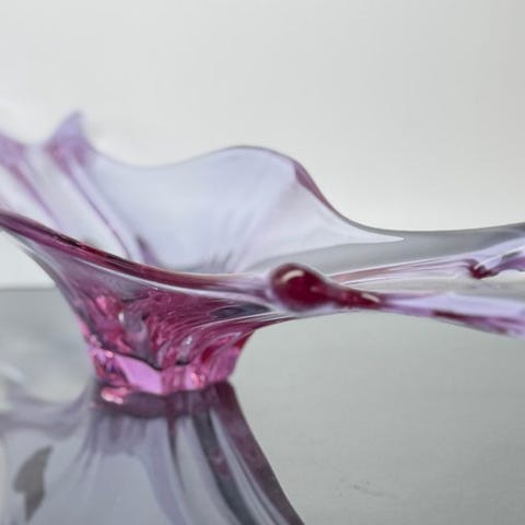 Formet krystal i rosa farve, med snoet dekor og en spiralformet base, som er karakteristisk for modellen.