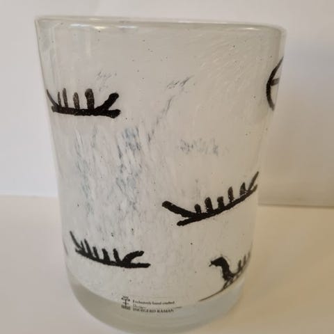 Organisk cylindrisk form med markante barkstrukturer. Den større vase viser en farvegradient i ravfarvede nuancer, omgivet af klart farveløst glas, den mindre vase viser smukke blå nuancer. Farveintensiteten aftager mod basen. Dybde-lignende reliefstrukturer, der minder om en træbark. Vidunderligt farvespil og smukke optiske effekter – især ved passende belysning. Meget dekorativt samlerobjekt!