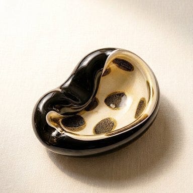 Murano-glas-skål fra 1970'erne, produceret i Murano, Italien, og underskrevet i bunden af Davide Dona. Et elegant Murano-glasstykke i grå fumé med gyldne reflekser, som bruger bullicante-teknikken med kontrollerede bobler inde i glasset. Askebægeret har en smuk form, der buer sig på den ene side.