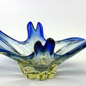 Fremstillet efter teknikken "Bullicante", med en bukket kant og en dekorativ fordybning. Bordskål i Murano-blåt og hvidt glas med indslag af guldblade og bobleeffekt kontrolleret af bulle..