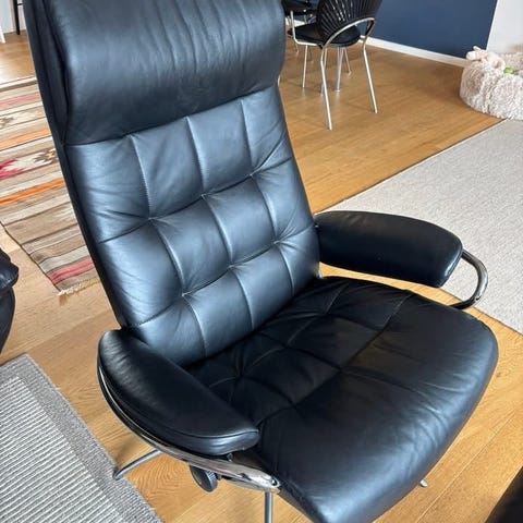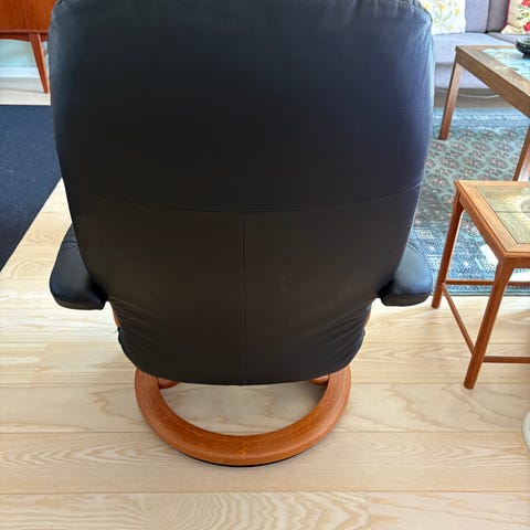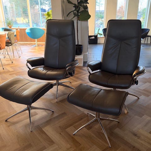 En raffineret, matched 4 af Stressless-sofaerne fra Ekornes, der forener skandinavisk komfort med en elegant, tidløs silhuet. Klædt i blå læder med varme bøgdetaljer, designet til afslappet lounge-sæde med dreje-funktion.