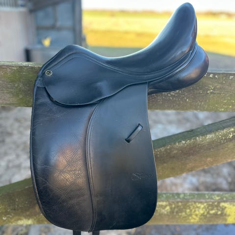 Dressursadel i sort læder. Sadel med dybt sæde og lange knæpuder, velegnet til dressurridning.