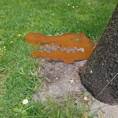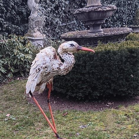 Smuk jernskulptur, ideel til have i rustik stil, udendørs eller indendørs - moderne kunst i rustent metal - skulptur til haven, bordets midte eller blomsterbed. Den måler 50 cm i højden og 20 cm i bredden.