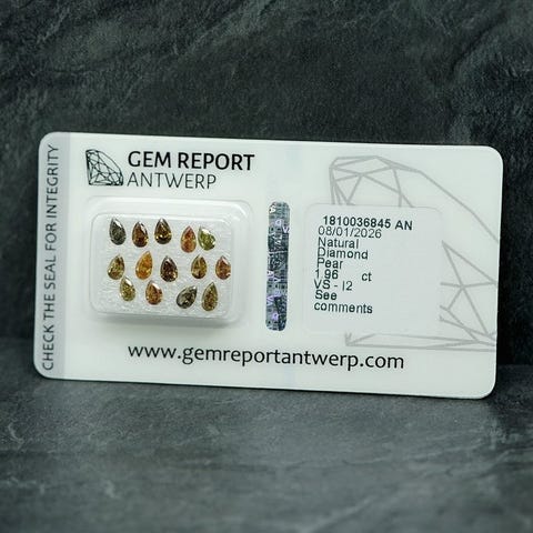 Fem naturlige fancy gule dråbeformede diamanter i samlet vægt 1,10 ct, VS1 klarhed, snit Birnenschliff, oprindelse Afrika, ledsaget af Gem Report Antwerp (GRA) certifikat nr. 1810036795 og forseglet af laboratoriet, lasergravering ikke til stede. Klik på den blå "gå til varen" knap, for at købe eller byde på denne vare. Den samlede pris vil blive vist inden du afgiver dit bud.