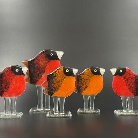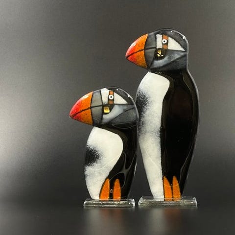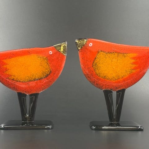 To håndlavede glaspapegøjer fra Polen i en sammensmeltningsteknik med opalgasl glas og 24 karat guld; signeret af kunstneren og med certifikat på ægthed, pakket i elegante gaveæsker, dimensioner pr. stykke: højde 10 cm, bredde 8 cm, dybde 5 cm, vægt 400 g. Klik på den blå "gå til varen" knap, for at købe eller byde på denne vare. Den samlede pris vil blive vist inden du afgiver dit bud.