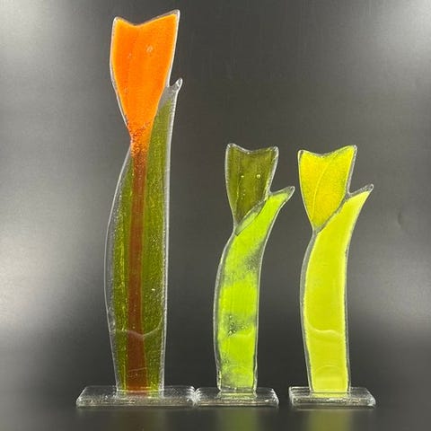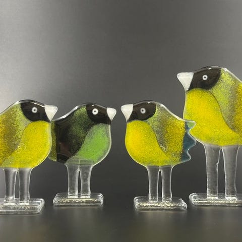 To stående gyldne papegøjer - håndlavet i en fusions-teknik af Maciej Habrat, en polsk kunstner som har arbejdet med glas i over 20 år. Opalglas og 24 karat guld fusioneres for at skabe disse moderne og farverige former. Glas gyldne papegøjer er magiske stykker, de vil uden tvivl fremhæve rummet og fange tilskueren opmærksomhed. Dimensioner: højde 16 cm, bredde 8 cm, dybde 5 cm. Emballage: de leveres i elegante gaveæsker