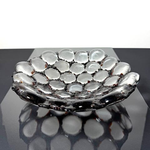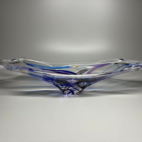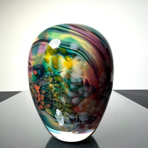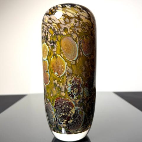 Dekor med en baggrundsboble blæst i gennemsigtig gulorange, opalinerede farver, masse og nuancer i glas.