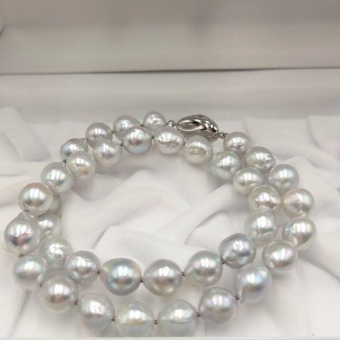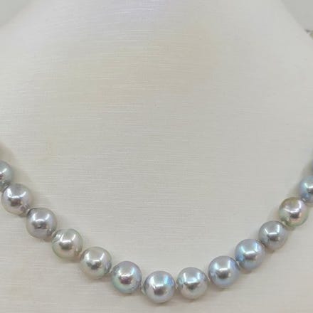 Et perlekæde af hvide saltvands-Akoya-perler med fremragende glans, afsluttet med en sølv kuglelås.
