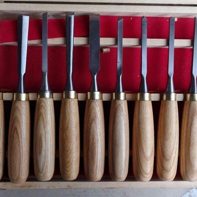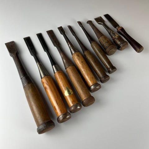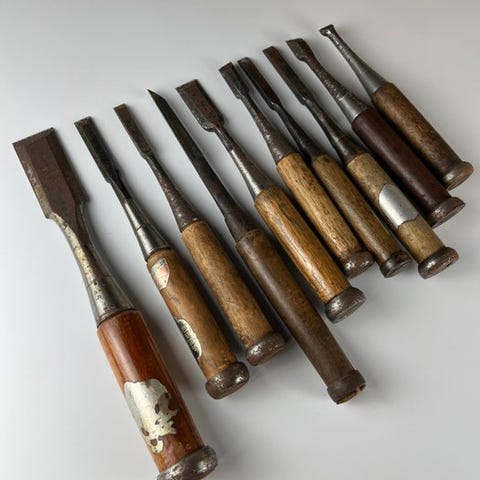 Dette er et vintage sæt japanske mejsler til snedkerarbejde og træskæring.