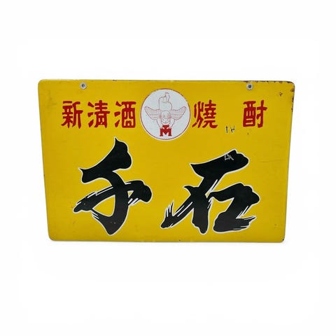 Originalt japansk emaljeret reklametavle med et kraftfuldt og minimalistisk design i rød og hvid. Skiltet viser et stort japansk tegn (kanji), der står for “sake” (alkohol/risvin), hvilket ofte bruges ved traditionelle japanske drikkesteder eller spiritusforretninger.