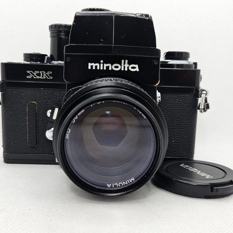 Kameraet er udstyret med et Minolta MD Rokkor 50mm f/1.7-objektiv, kendt for sin fremragende optisk kvalitet og skarphed. Inkluderer også et teleobjektiv Makinon multi-coated (ca. 135mm), ledsaget af den respektive hårde etui.