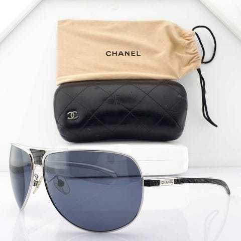 Chanel Aviator solbriller med sølvfarvet metal og brune detaljer, baguette Swarovski-krystaller og Chanel-templet logoer, ramme i acetate og metal med grå gradientlinsen, fremstillet i Italien, én størrelse, i god stand med lettere slid, ægthedskode 4121-B c.304/13; inkluderer etui og støvpose. Klik på den blå "gå til varen" knap, for at købe eller byde på denne vare. Den samlede pris vil blive vist inden du afgiver dit bud.