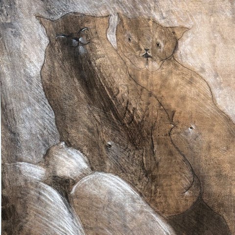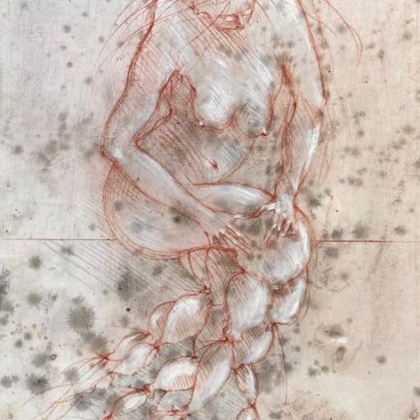 Teknik: Blandteknik på papir (kulspids, blyant, hvide højdepunkter og materialeeffekter)