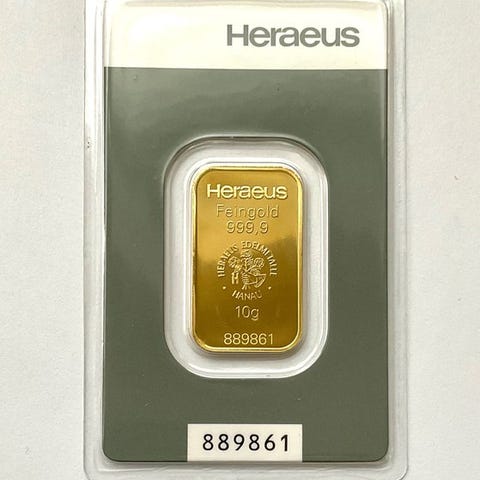 Heraeus 10 gram guldbarre af ren 999,9 finhed.