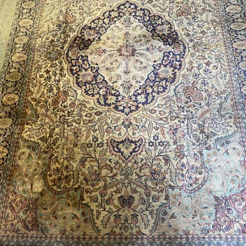 Smukt håndknyttet silketæppe. Silken er naturligt farvet uden kemikalier. Hovedfarverne er creme, blå, brun og grøn. Tæppet er vævet med en smuk professionel stram knude og har korte frynser.