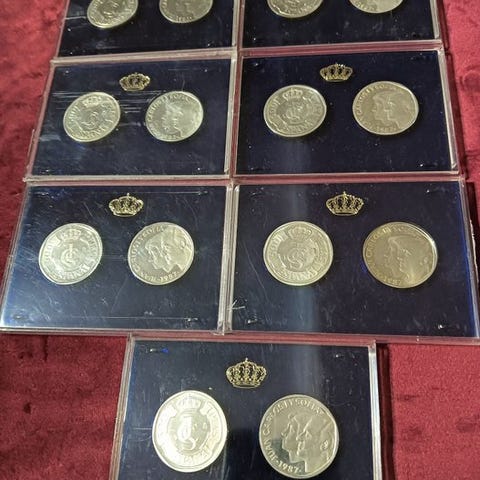 Gennemsnit 25 gram og 37 mm i diameter. Medfølger fotografier og individuelle målinger af hver mønt.