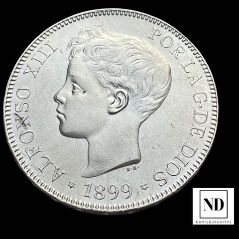 Lote af 10 mønter af fem pesetas i sølv 900. År 1871 *71. Regering under Amadeo I af huset Savoy. Et eksempel på de berømte "duros".