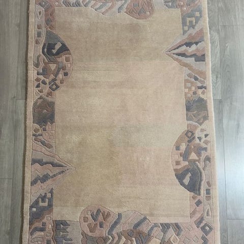 Det ensfarvede, varme beige baggrundsfelt virker klart og tilbageholdent. Den omgivende kantbård er udformet med stiliserede geometrisk-etniske ornamenter i diskrete blå og naturfarver og giver et elegant, dekorativt præg uden at overbelaste helheden.