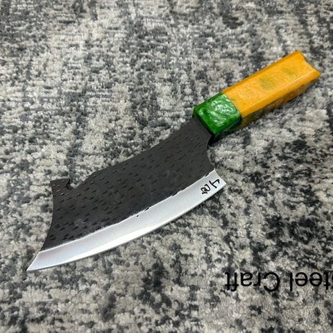 Et moderne kniv med buet blad af rustfrit stål, kombineret med et naturligt træhåndtag, der giver et behageligt og sikkert greb. Bladet har en elegant buet kurve og en forfinet overfladefinish, hvilket giver det både funktionel effektivitet og visuel appel.