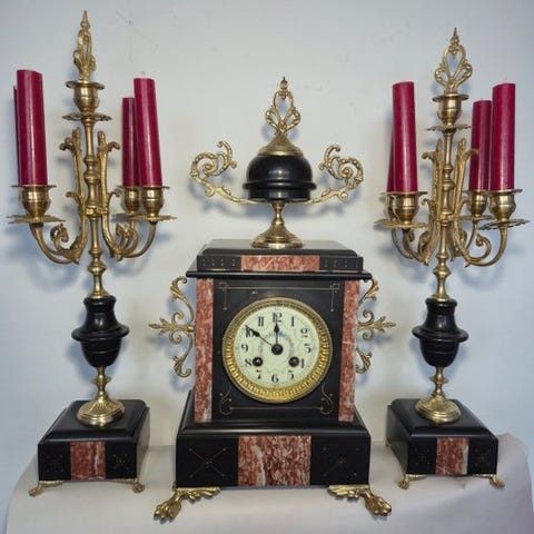 Antik Napoleon III-patineret bronzefigururur med marmorbund fra Frankrig, cirka 1860–1880, mekanisk 8-dages urværk, halvtime slag på én klokke, fremragende stand og i fungerende orden, 46 cm høj, 60 cm bred, 24 cm dyb, vægt 36 kg, med nøgle. Klik på den blå "gå til varen" knap, for at købe eller byde på denne vare. Den samlede pris vil blive vist inden du afgiver dit bud.