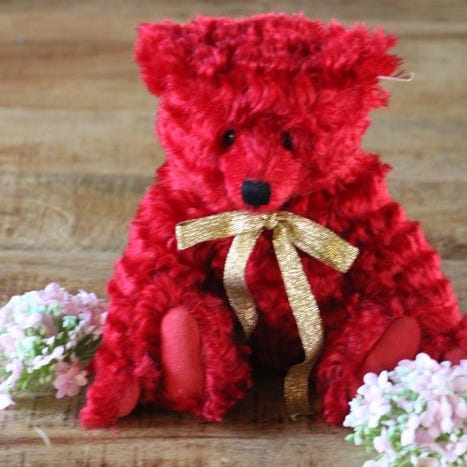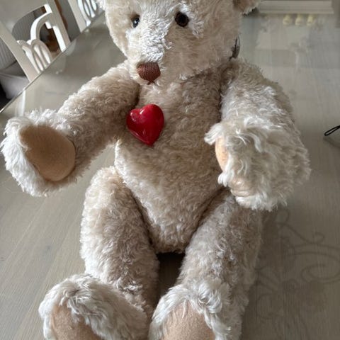 Teddy Baby-replica fra 1930, lavet af Steiff i 1992. Den er cirka 35 cm høj. Fremstillet af mohair. I god stand.