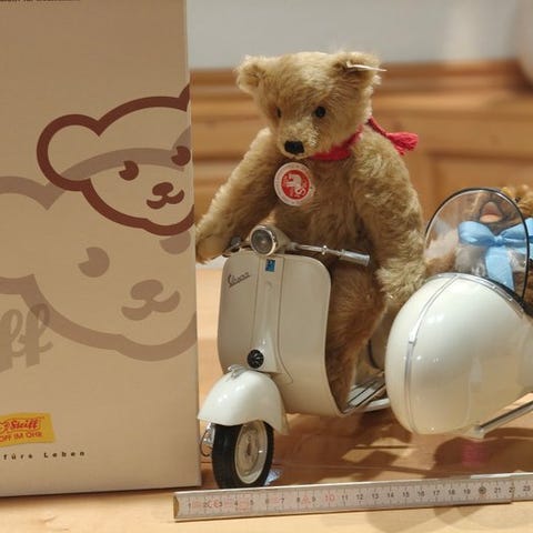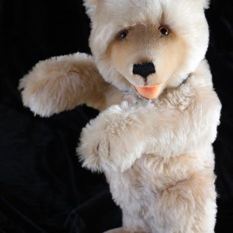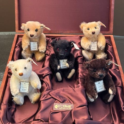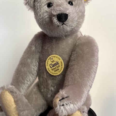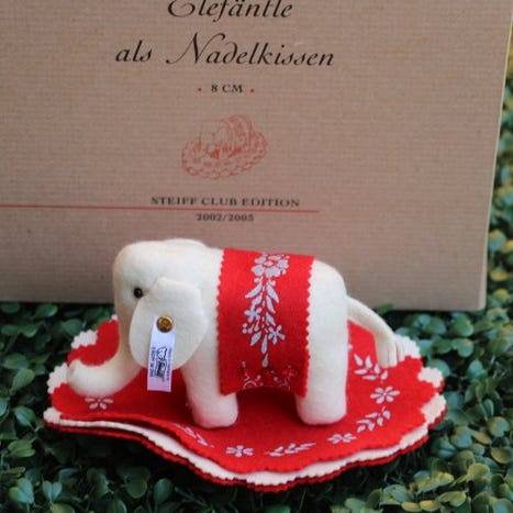 Steiff: nålepude med en frø. Replica fra 2003 af originalet fra 1903. Kun tilgængelig for klubbens medlemmer. Kikkerens størrelse er cirka 6 x 6 cm. Bladet, som frøen sidder på, er også af filt og måler 10 x 9 cm. Ny tilstand i original æske med certifikat. Tilbydes ikke ofte.