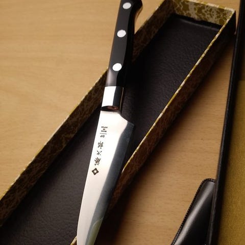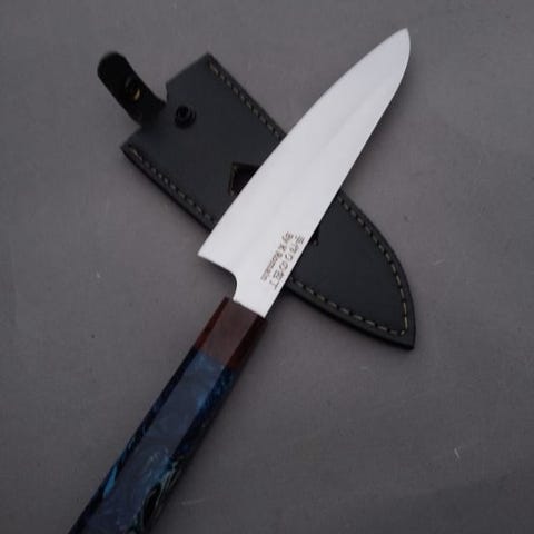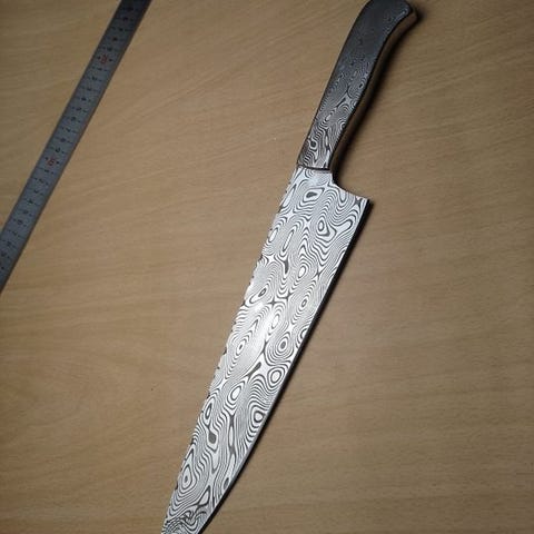 Denne store kokkekniv med et barberbladskarpt blad i højcarbonstål slibes til at glide ubesværet gennem proteiner, grøntsager og fine ingredienser med samurai-lignende finesse. Dets lange, elegante profil efterligner en traditionel katana og giver enestående balance og kontrol til hurtige, rene snit. Håndtaget, omhyggeligt formet for ergonomisk komfort, sikrer en sømløs forlængelse af hånden. Uanset om den udfører papirtynde sashimi eller styrer et travlt køkken, legemliggør Tatsu kraft, elegance og ufortrødent skarphed — en drage blandt knive, tæmmet kun af en mester greb. Den har et ætset mønster indgraveret i bladet.