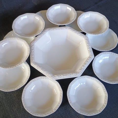 Et sæt bestående af 5 dybe tallerkener produceret i Tyskland af Rosenthal mellem slutningen af 1980'erne og begyndelsen af 1990'erne, modellen Maria Bianco. Tilstand: Fremragende. Hurtig forsendelse og sikker emballage.