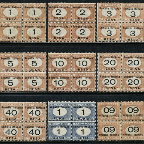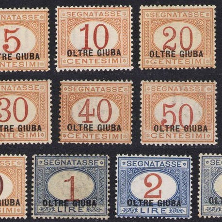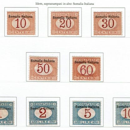 Italiensk Somalia, Segnatasse serie fuldendt af 11 værdier med overtryk øverst, Ny uden gumme, certificeret med Cilio-certifikat (fra 1909), Sassone T12/22. Klik på den blå "gå til varen" knap, for at købe eller byde på denne vare. Den samlede pris vil blive vist inden du afgiver dit bud.