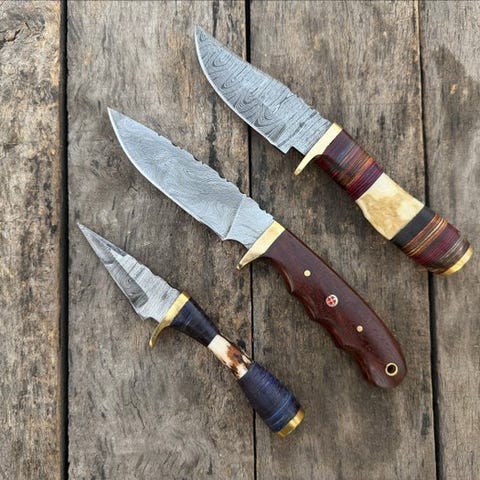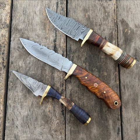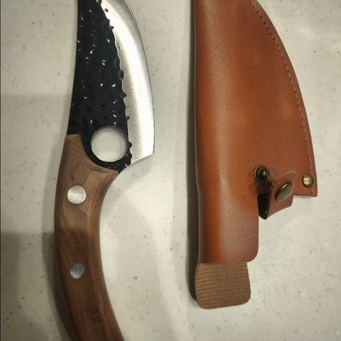Køkkenkniv - Jagtkniv med bølget blad og træhåndtag — inkl. læderskede - Stål...