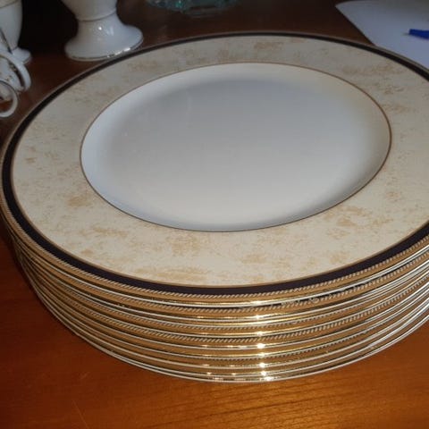 Til salg en enestående sjældenhed for samlere og elsker af høj kvalitet engelsk håndværk: et storslået komplet Wedgwood-servise i den prestigefyldte Florentine Turquoise-dekor, ikonisk for sin relief-glasur i turkis med falkemotiver og brune detaljer. Sættet er et ægte lagerfund fra 80’erne, aldrig brugt, aldrig vasket og omhyggeligt bevaret i dets originale æra-kasser. Den ekstraordinære særegenhed ved dette tilbud ligger i rigdommen af sammensætningen, tænkt til at rumme 12 personer med en usædvanlig omfattende udstyr, der inkluderer hele 24 flade tallerkener (ideelle til at håndtere flere retter eller store receptioner), ud over 12 dybe tallerkener, 12 desserttallerkener, en enorm suppeterrine med låg, salatskål, sauseskål og forskellige serveringsbakker (firkantet underfad under sauskål, stor rund tallerken og stor oval tallerken).