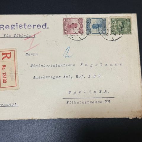 - GERMANY post in China 1906 issued 1cent stamp overprinted 2cents with Germany Postoffice in Peking dated 10 July 1908