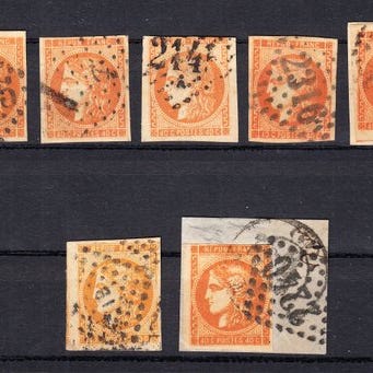 Fra Frankrig, Bordeaux-serien, katalognumre ifølge Yvert: 39C, 40B, 41B, 42B, 43B, 44A, 45A, 46A, 47, 48, 49, ældste mærkninger fra 1870, i oblitereret stand. Klik på den blå "gå til varen" knap, for at købe eller byde på denne vare. Den samlede pris vil blive vist inden du afgiver dit bud.