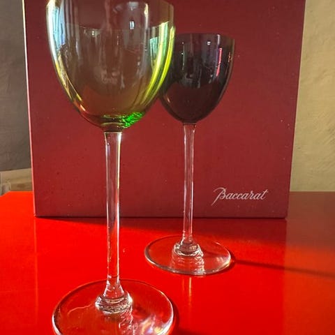 Sjældent og elegant vinservise i farvet krystal, bestående af seks matchende glas, fremstillet af den prestigefyldte Baccarat-hus, et symbol på excellence inden for fransk glaskunst gennem mere end to århundreder.