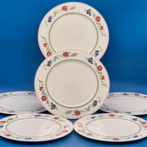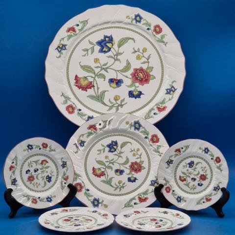 Dekor: Polykromt floralt dekor med røde, blå og gule blomster samt fine linjeornamenter