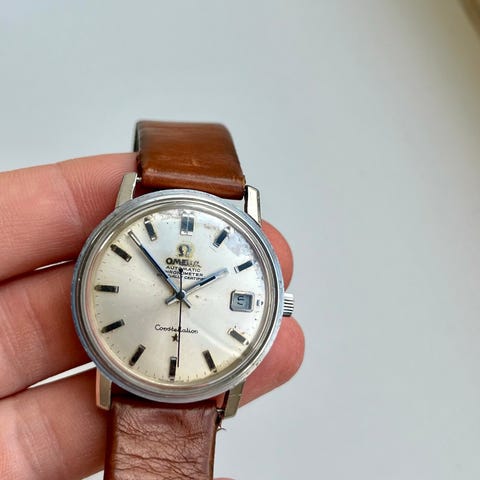Omega Constellation Chronometer, automatisk, sølvfarvet kasse, 33 mm, herre, læderrem, 1970’erne, meget god stand med mindre brugsspor, ingen æske, papirer eller garanti. Klik på den blå "gå til varen" knap, for at købe eller byde på denne vare. Den samlede pris vil blive vist inden du afgiver dit bud.