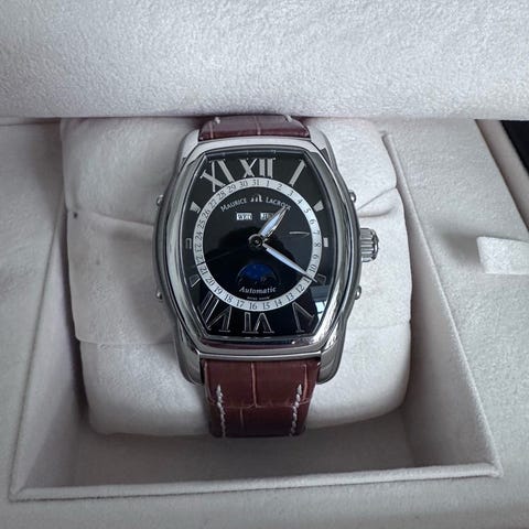Jaquet Droz herreur, model Grande Seconde, referencenummer j003036208. Uret drives af et automatisk urværk (Jaquet Droz Caliber 2660Q2.4), som også er synligt gennem bagsiden. Urskiven består af smukke naturlige perlemor, og står flot i kontrast til de sorte og røde accenter. Tidsvisningen består af en forskudt timer- og minutvisning ved 12-timers position, og en sekund/dato-subdial ved 6-timers position. Glasset er safir.