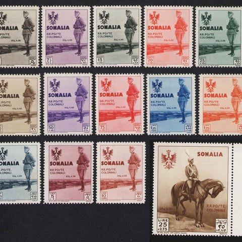 Et særligt eftertragtet sæt frimærker fra Somalia til samling. Kolonien Somalia, 1909 - Segnatasse fra Kongeriget Italien 1890/1903 overtrykte SOMALIA ITALIANA øverst. Hele sættet bestående af 11 værdier, nye, originalgummi intakt. Sassone 12/22 - S. 64. Katalogværdi i Sassone € 3.500,00.